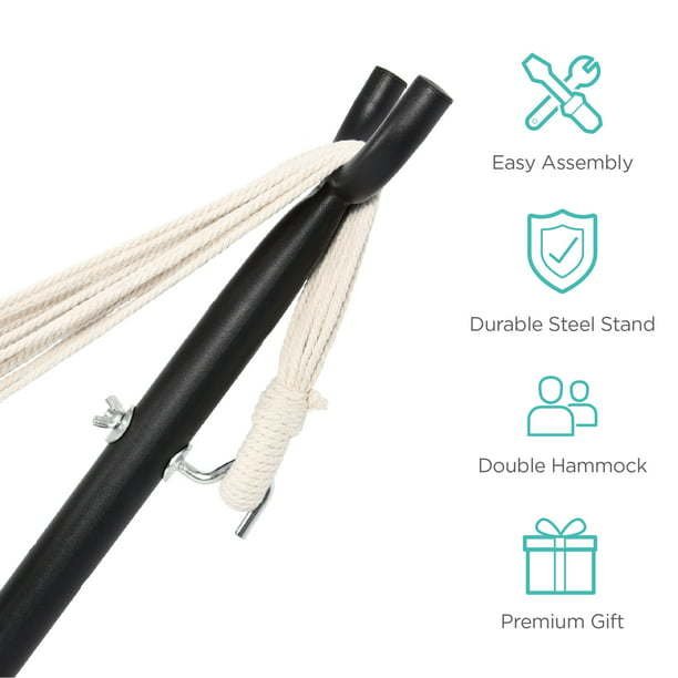 • A double hammock provides a comfortable space for relaxation whether you're camping or spending time at home.Hammocks come with a 10FT steel stand that is secure and stable. Relax at your maximum with this double hammock. Take it on the    go for portable & durable use. Tool-free assembly & easy disassembly means you can set up anywhere! Woven cotton conforms to your body for unseen levels of relaxation and ultimate comfort. This premium gift has every feature you need, including    its double hammock style, durable steel stand, and easy assembly. Perfect for indoor/outdoor use, this hammock holds up to 450 pounds with the help of a reinforced metal support ring and a cotton polyester blend.