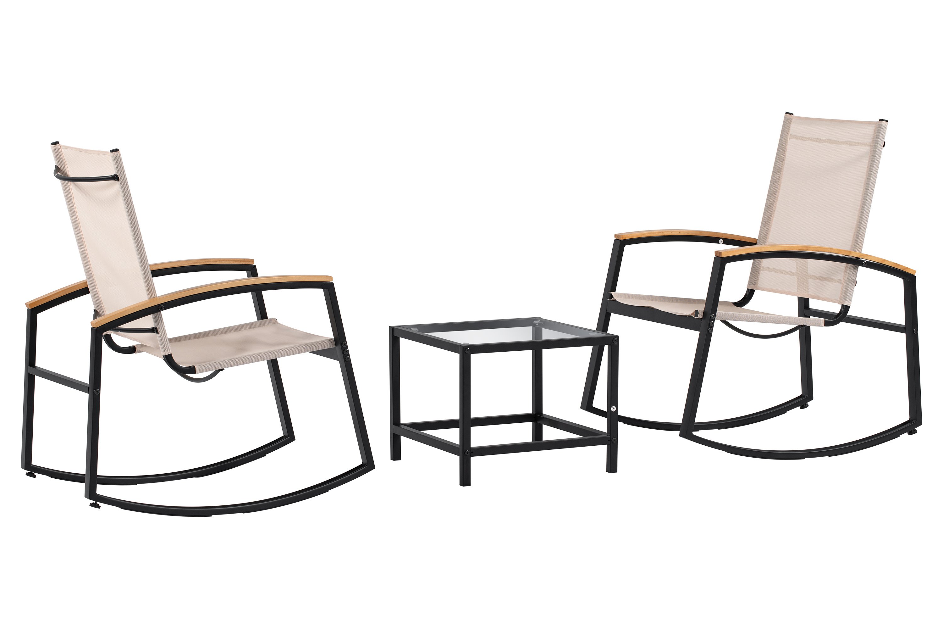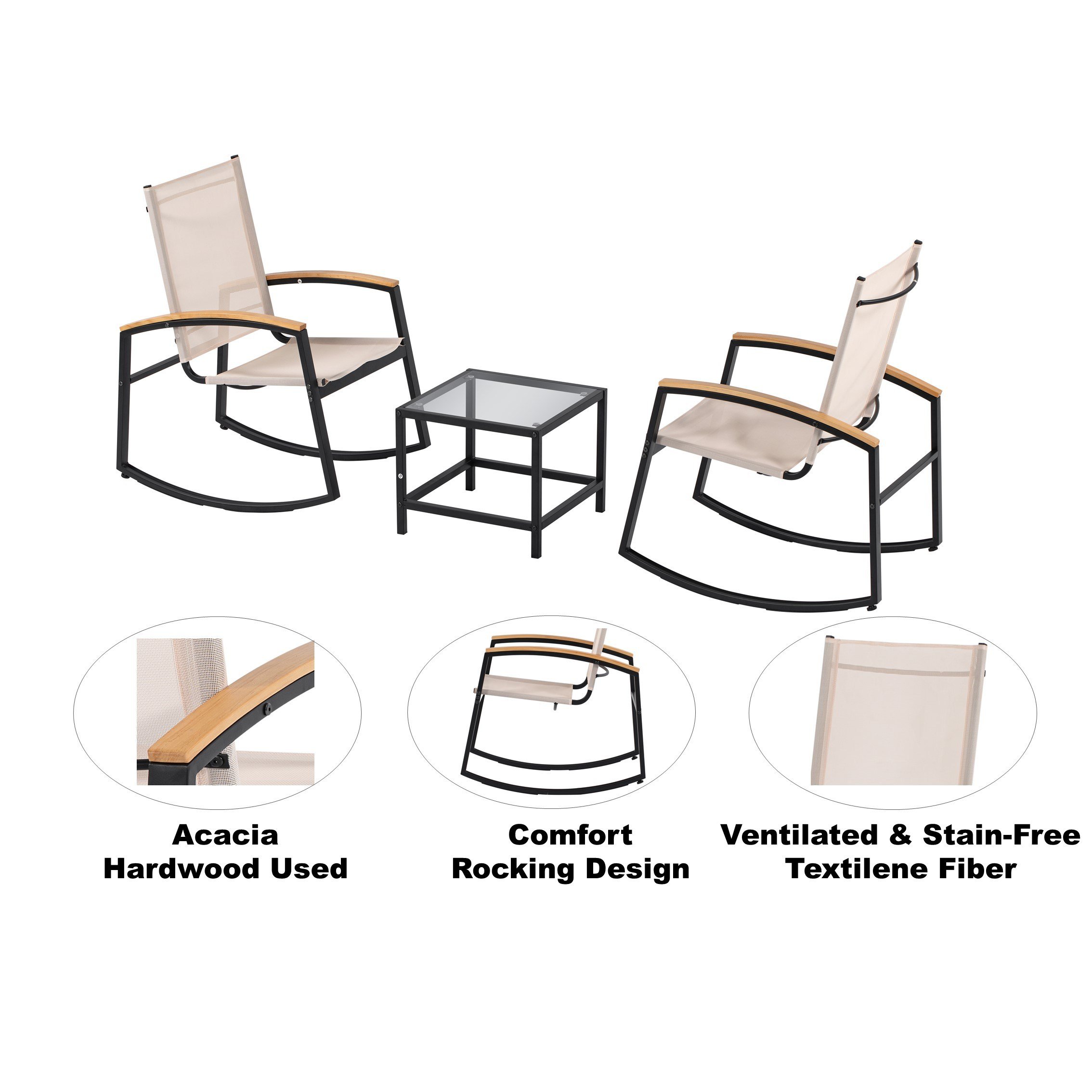 Create the most relaxing area in your home. Designed for your comfort with a modern style, this outdoor set is the most ideal choice for balcony, garden, yard or porch. This 3-piece rocking patio set will give you the most chilling atmosphere with a breeze and a glass of wine during the evening or the weekend, whether you are alone or chatting with your dear partner or friend.
