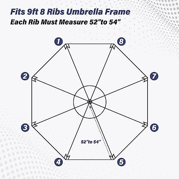 Fits: The patio umbrella replacement canopy fits 9 ft 8 ribs patio umbrellas. Each rib must measure 52" to 54", please measure your umbrella rib length before purchase.