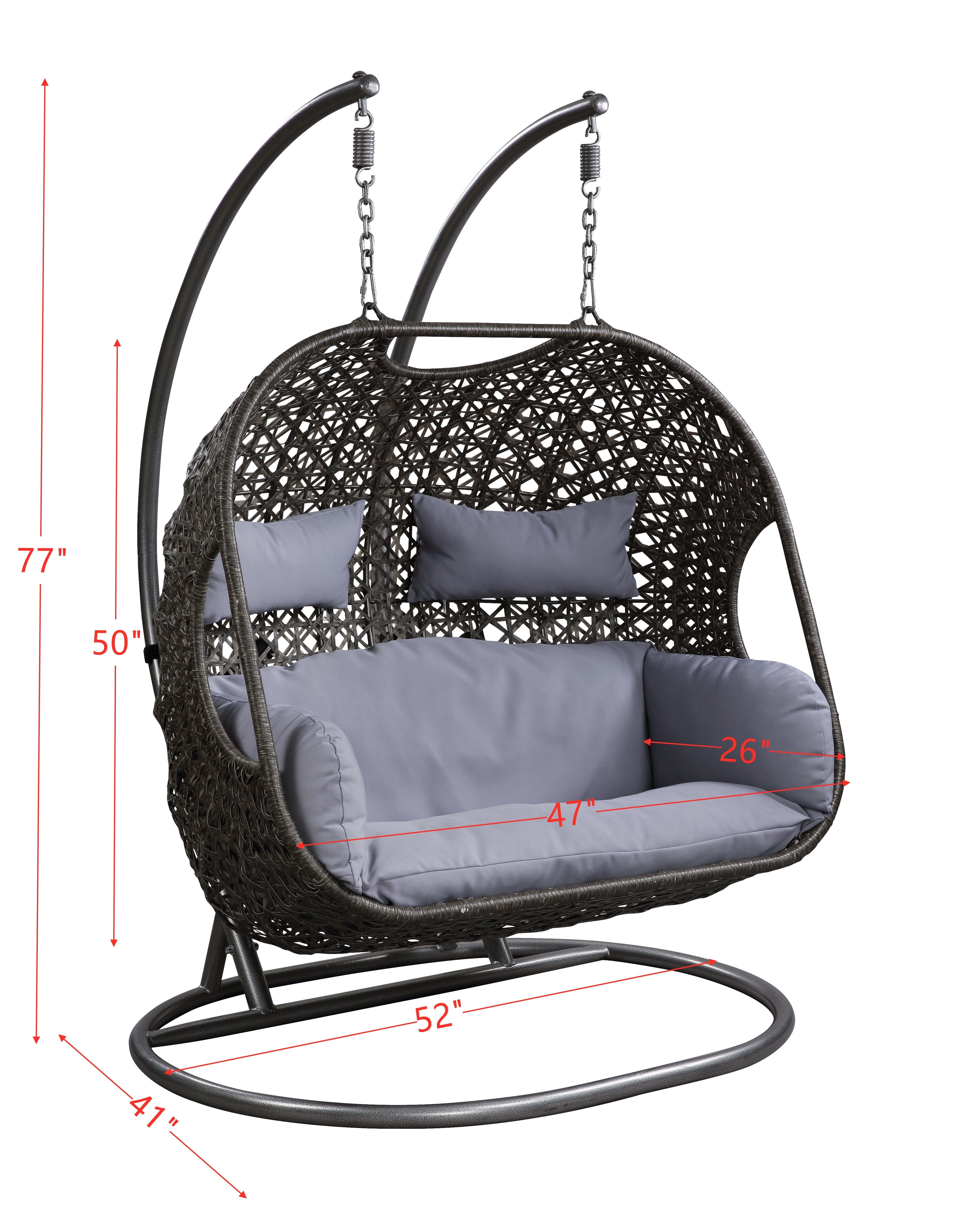 •KD, Patio Swing Chair & Stand• Seat Cushion Included (Removable)• Includes: Swing Chair, Stand, Cushion• CONSTRUCTION: Frame Black Finish, Wicker (mm Round) & Steel Powder Coated (mm)• SEAT CUSHION: Fabric• Material: Fabric (Solid Pattern)