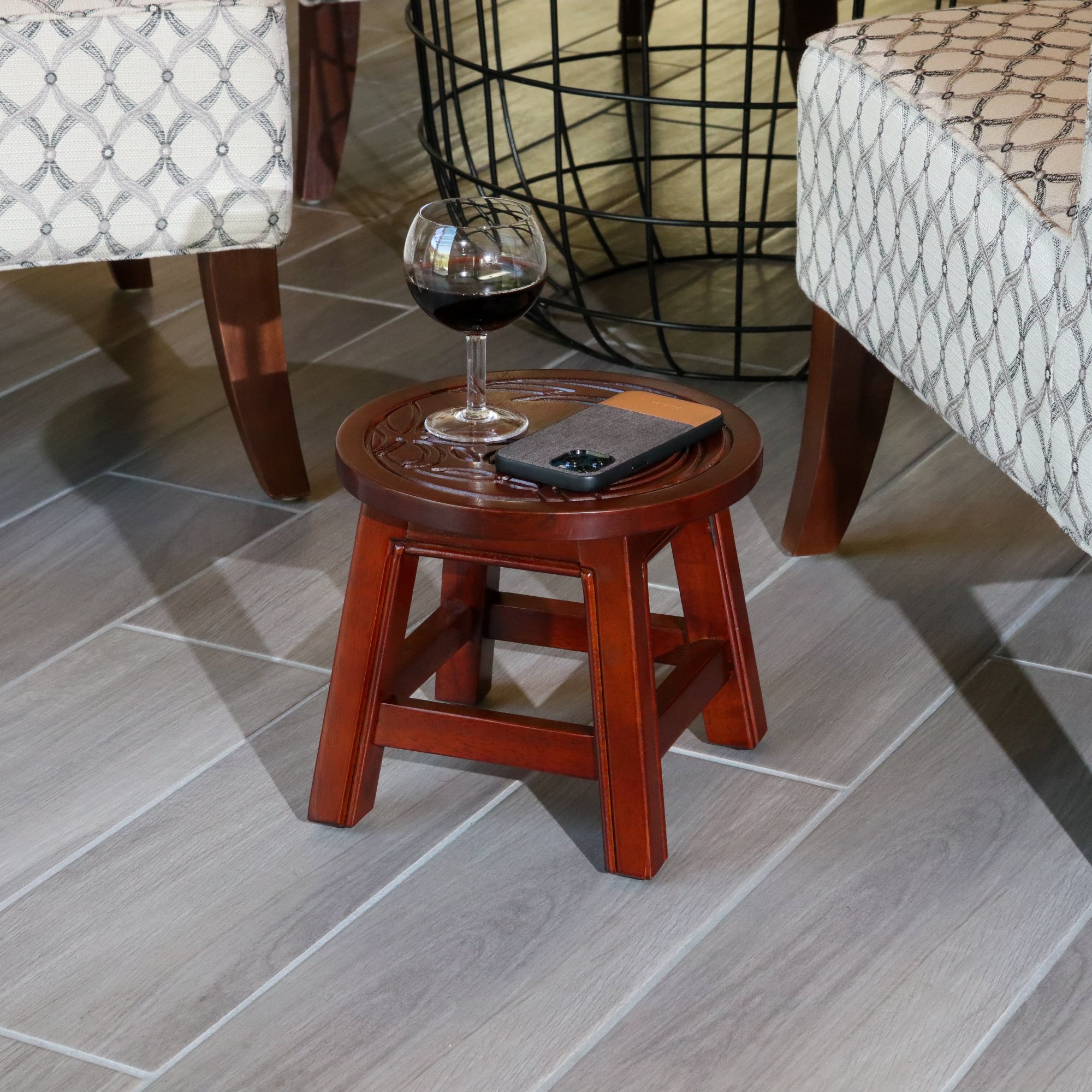 Carved Wooden Step Stool, Floral, Cherry