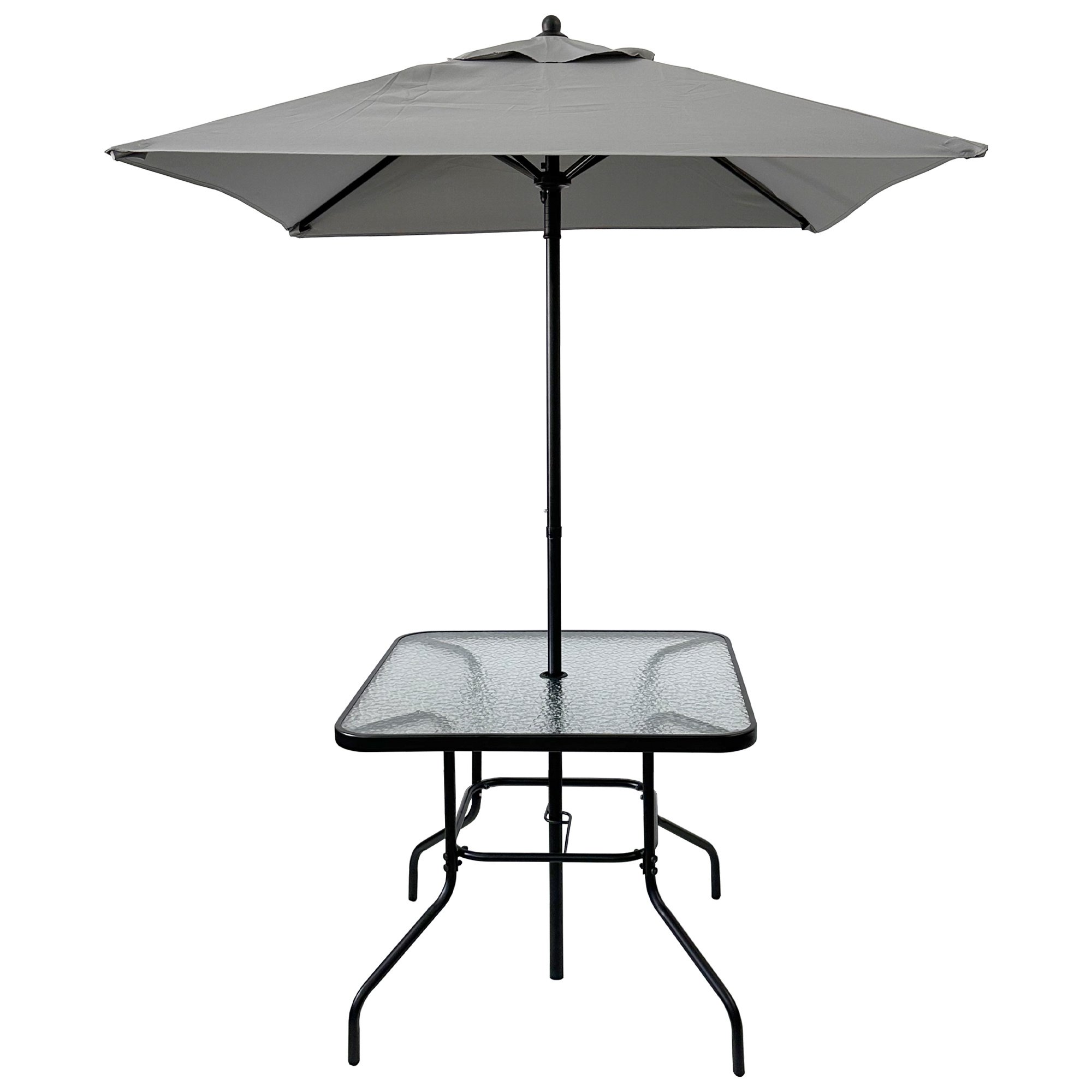 Includes 1 dining table, 4 folding dining chairs, 1 umbr