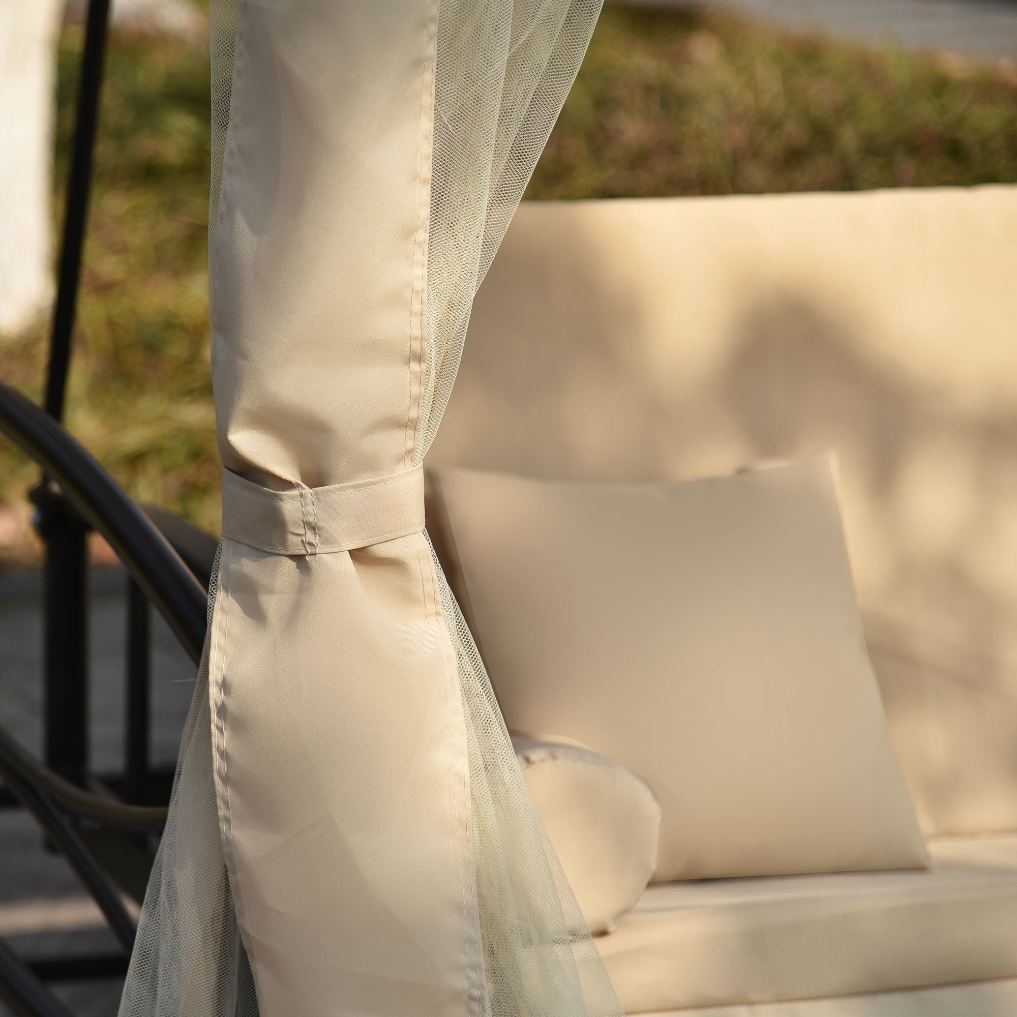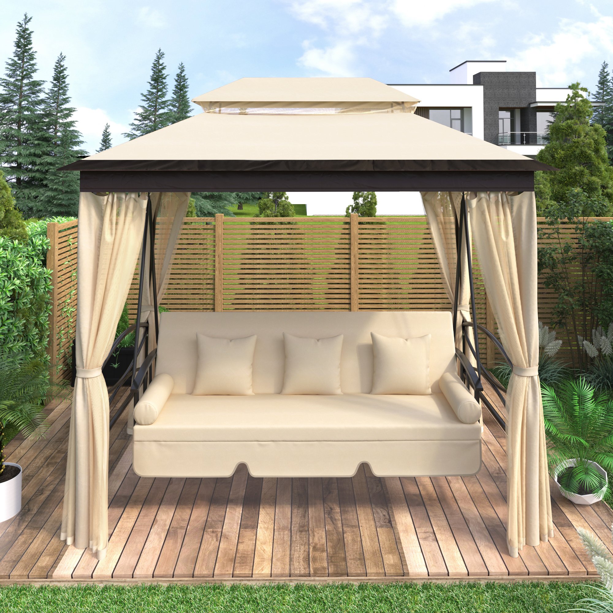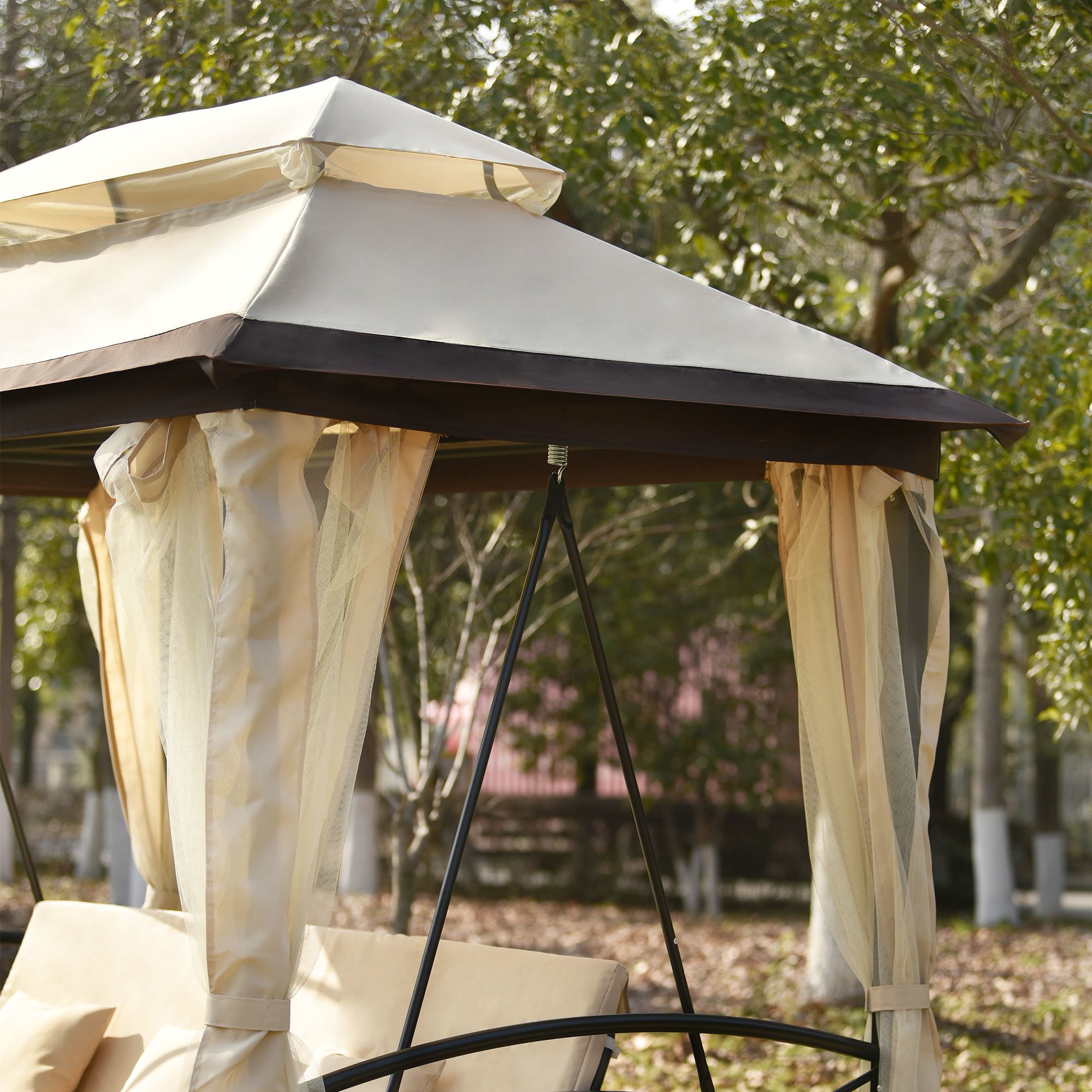 This stylish gazebo swing bench features a spacious and fashionable design; which can comfortably accommodate 3 people to sit and provide shade from the sun with its large canopy. It can be used as an excellent decoration for your garden; courtyard; and poolside for parties; BBQs; or resting. The reinforced 4 legs and 8 ground stakes can offer a firmly support in any weather. The waterproof and breathable PU coated fabric is ideal for use on hot and rainy days. Meanwhile; the 2-tier roof design brings a good air circulation for stability in various conditions.In addition; 4 zipper side walls prevent unwanted pets from entering and add more privacy to you.