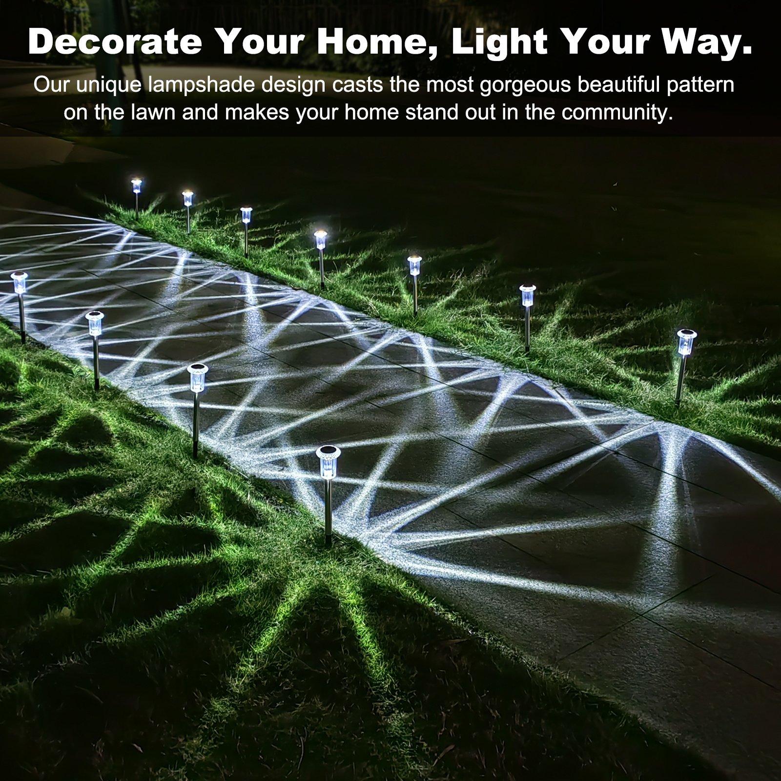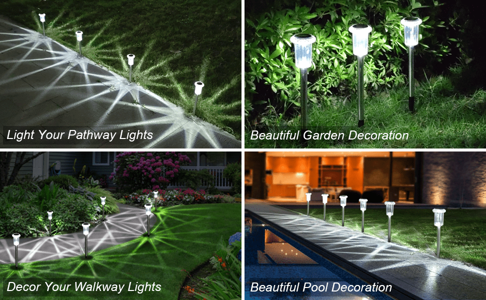 [Design Attractively]Unique design of solar path light provides a special and vivid pattern. This beautiful glow is perfect for your pathway, yard, garden, driveway, patio, and walkway decoration.[Sturdy Material & Waterproof]The main materials are made of Stainless steel and glass, so the solar powered path light has a stronger anti-collision resistance. IP65 waterproof rating, so the solar pathway light can work in rainy, cloudy, and small snowy.