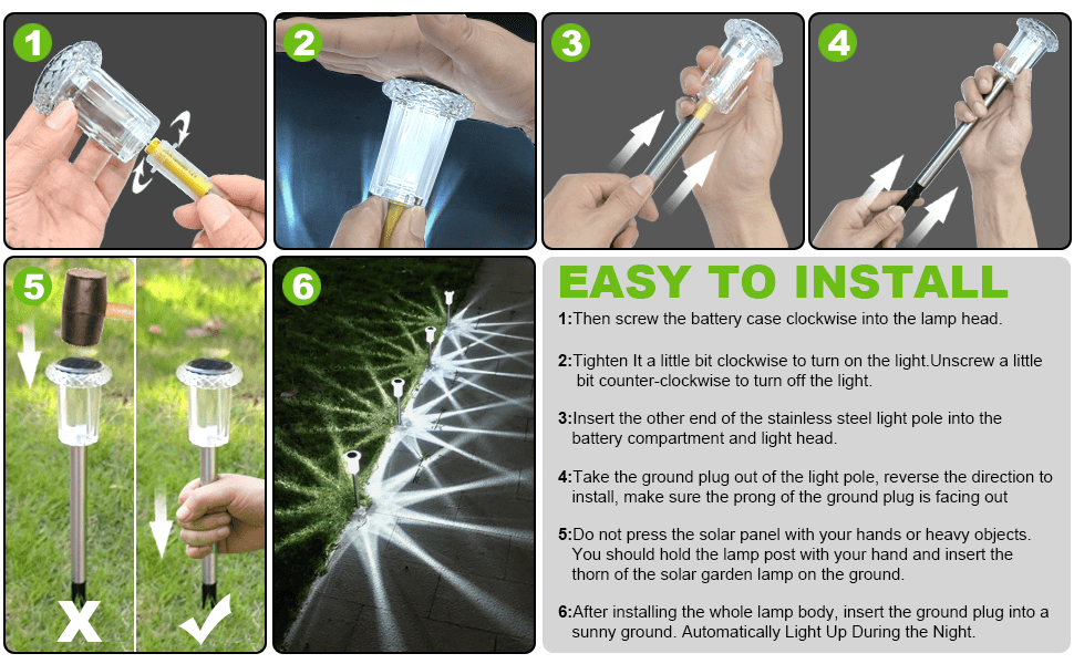[Easy to Install]there are no confusing wires, simple installation, push it in a place where it can be exposed to direct sunlight. If the soil is too hard, you can moisten the soil or dig a small hole first.
