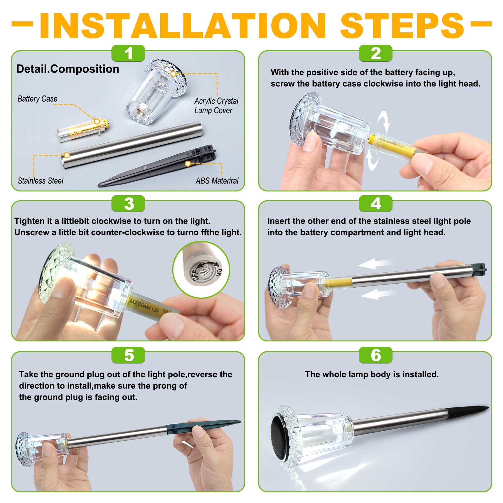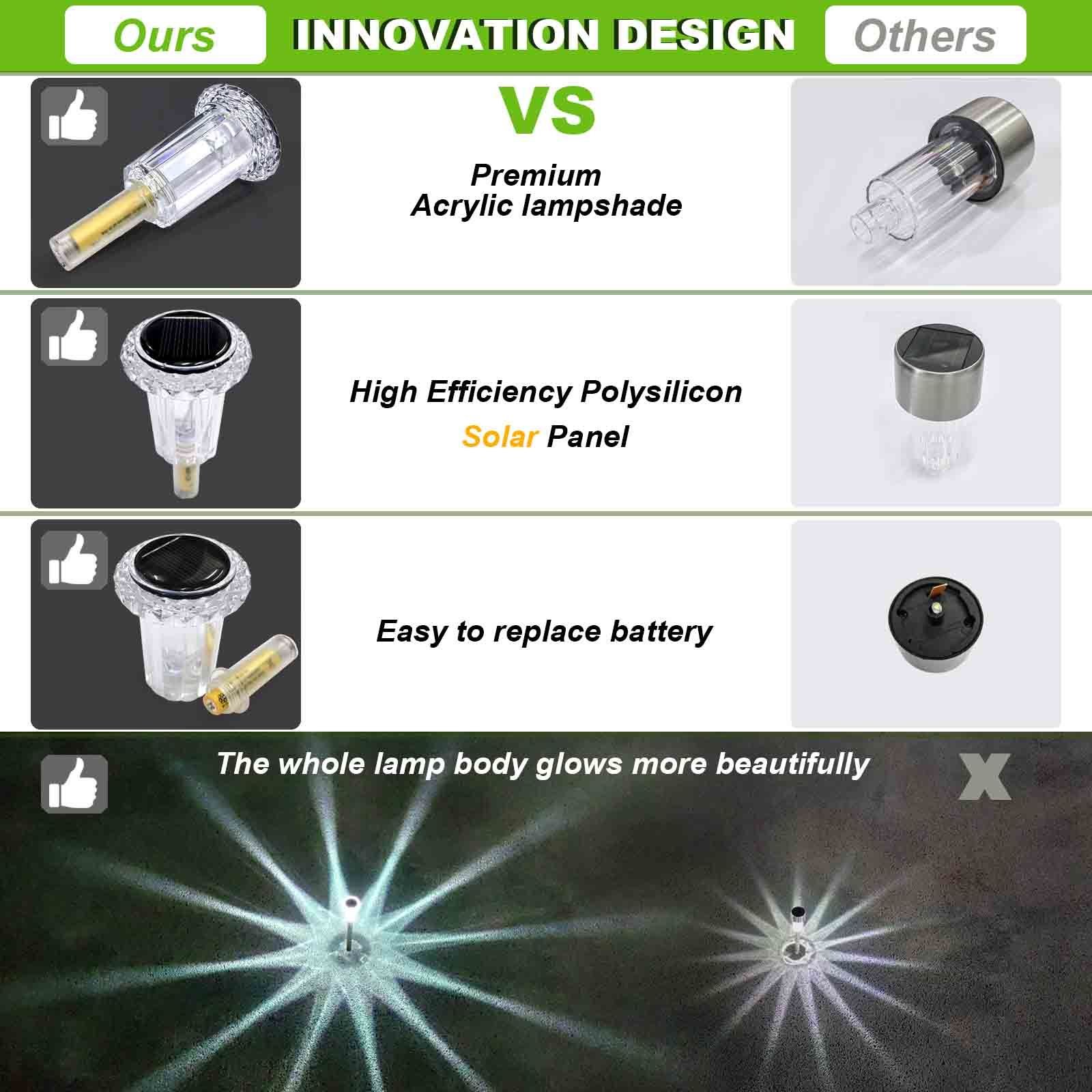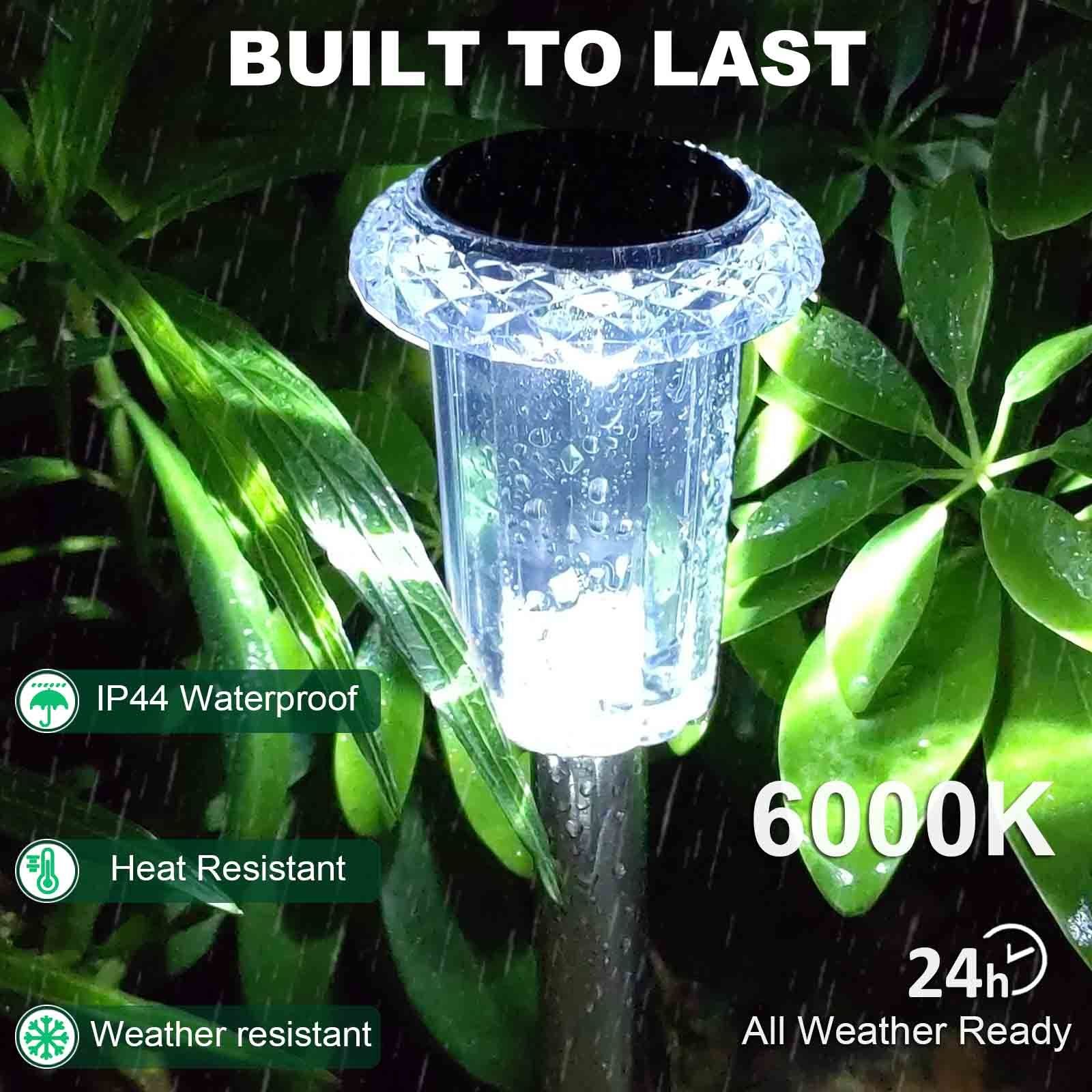 [Solar Powered]The solar garden light automatically charges 4-6 hours in direct sunlight and works automatically for up to 8-10 hours at night. The high-capacity Ni-Cr battery ensures a long period of light. Factors such as rainy days may extend the charging time.