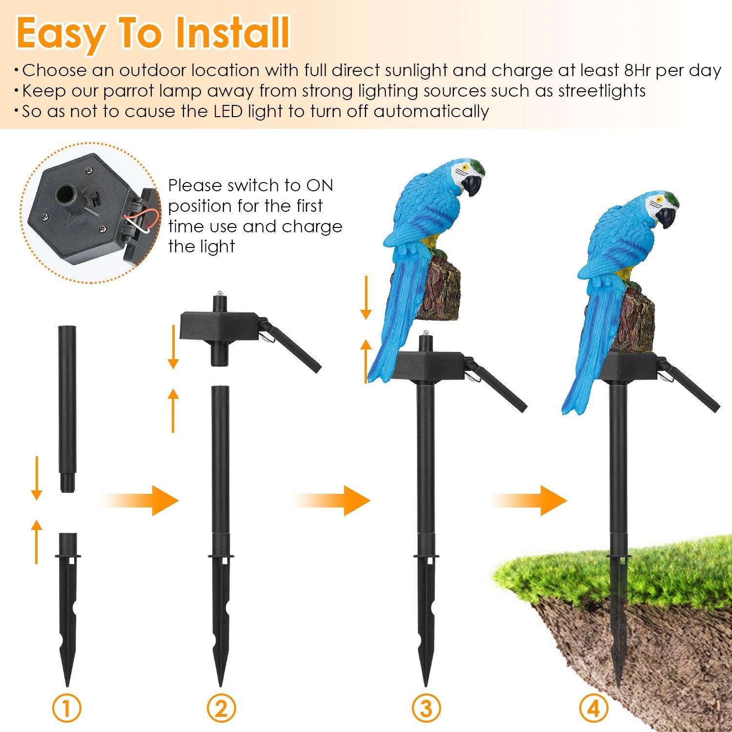 *Easy Installment*:Place the 'parrot' on the plastic pole and insert the stake into the bottom of the pole. Then insert it into the soft ground. No wiring required,no electricity needed,easy to use.