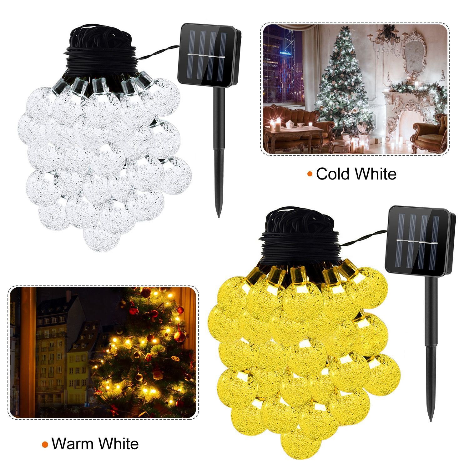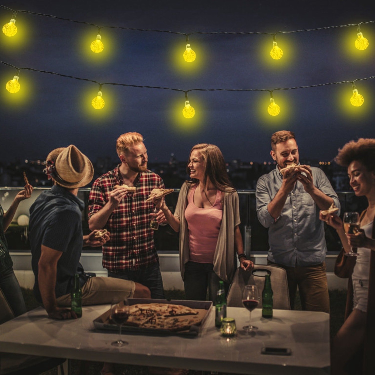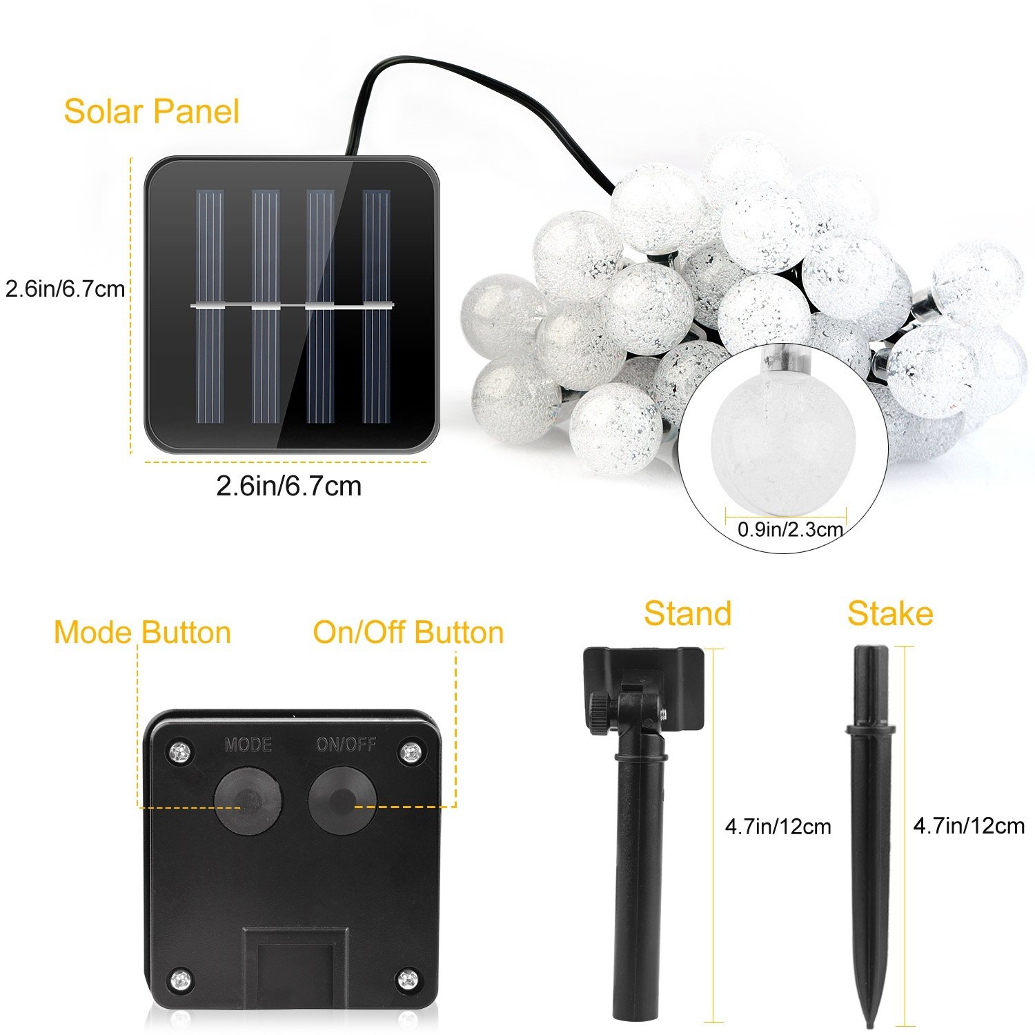 **8 MODES STRING LIGHTS*:30 globe bulbs dotted in a 20ft wire design,offering 8 lighting modes for you,such as slo glo,chasing,flash,twinkle and steady on,etc.. Set it twinkling to add a fairy atmosphere to your yard and impress your kids and whomever passing by,or select whatever mode you like to add a relaxed peaceful feel to patio,or add to the festive bustling parties,weddings,and holidays.