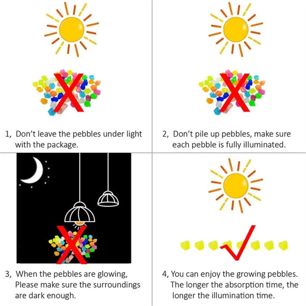 Best Decorating Landscape:These glowing stones pebbles, glow lasts about 3-4 hours in the dark after direct sunlight for about 30 minutes. The intensity of the glow will dissipate gradually.