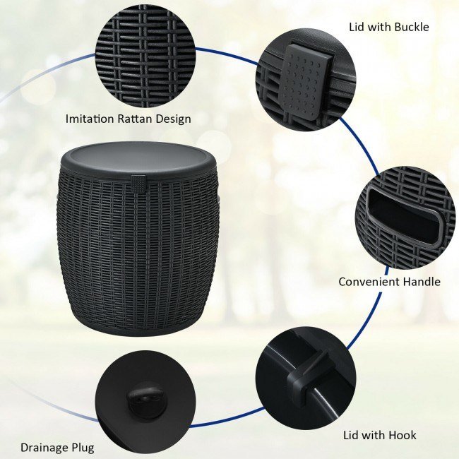 The lid comes with a buckle for convenient use and is fixed tightly by the hookMultiple uses as a patio side table; an ice bucket; a stool and a storage box9.5 gal capacity to provide various drinks and snacks for a group of peopleTwo handles on each side are convenient for transportationDrainage hole with a plug is designed for easy cleaning and emptyingAll-weather ice bucket with imitation rattan style is ideal for multiple placesSuitable for pool party; barbecue; camping; family gathering; etcInside container also is convenient to clean with damp cloth
