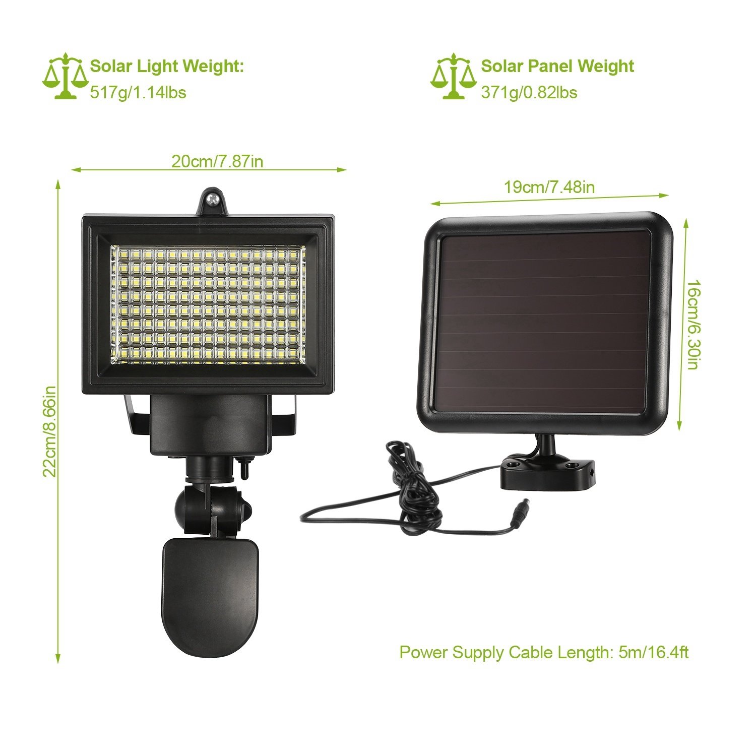 **100LEDs Ultra-Bright Solar Powered Lights*:Inbuilt bright 100 LEDs with 1000lm maximum output and sensitive motion sensor with 120° wide sensing angle which provide up to 180° illumination range and turn the dark space into a bright lighted space for security and safety protection.