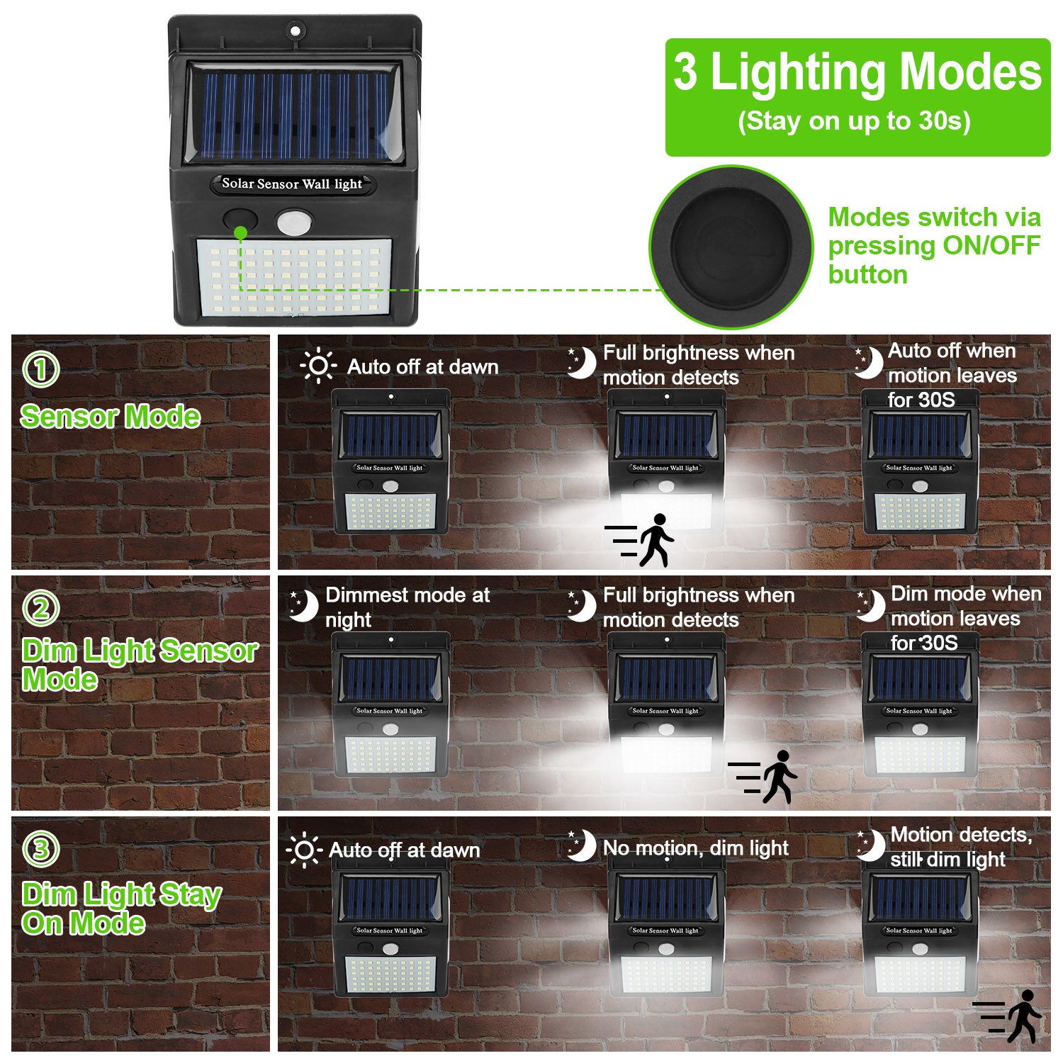 **3 Lighting Modes*:Mode 1:Full brightness when motion detects at night;Mode 2:Turns from dimmest light to full brightness when motion detects at night;Mode 3:Constant dim light at night. 3 Lighting modes switch through pressing ON/OFF button.